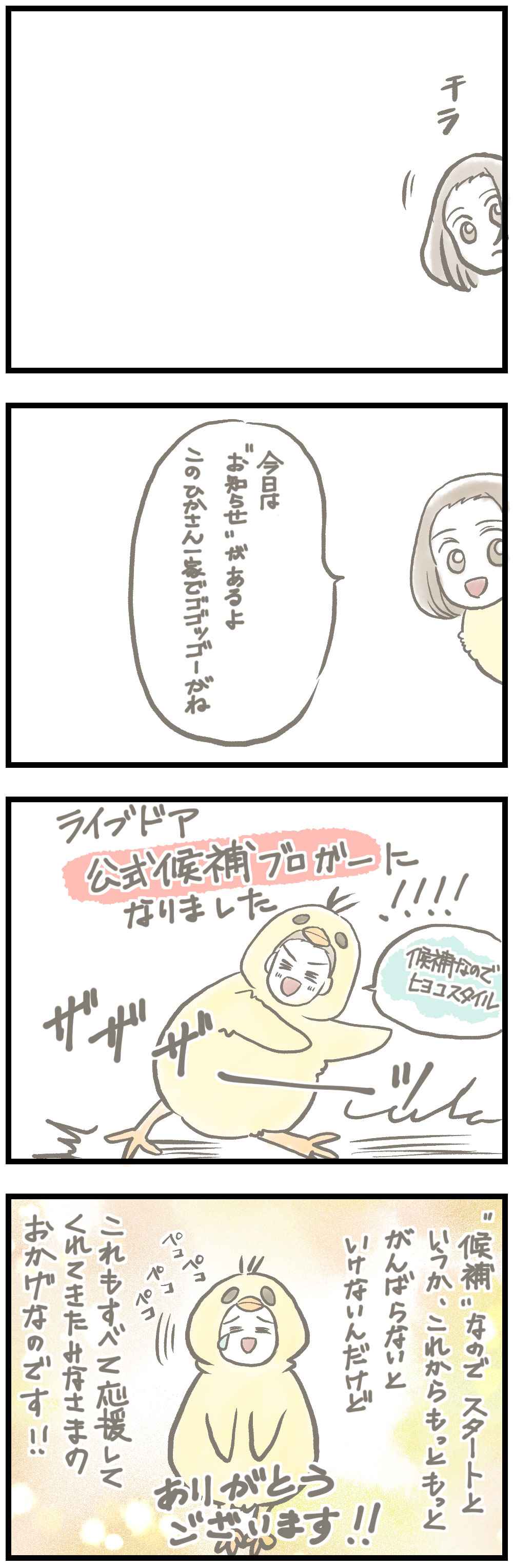 今後も無理のないペースで更新して下さいね。そして、候補の文字が外れて公式ブロガーに昇格されるよう祈っております。