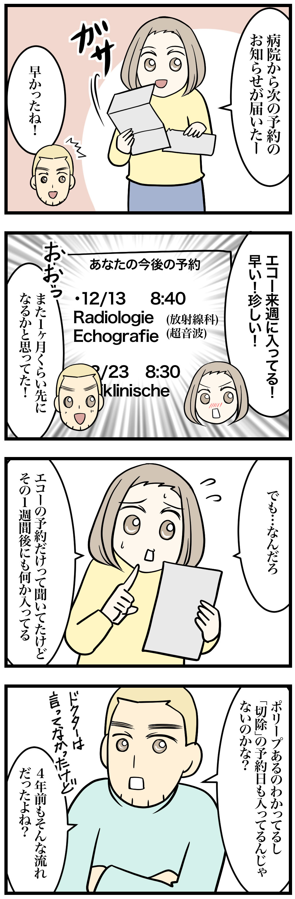 前回ドクター「エコーの予約だけ」って言ってたのに新規予約4つってどういうこっちゃ。