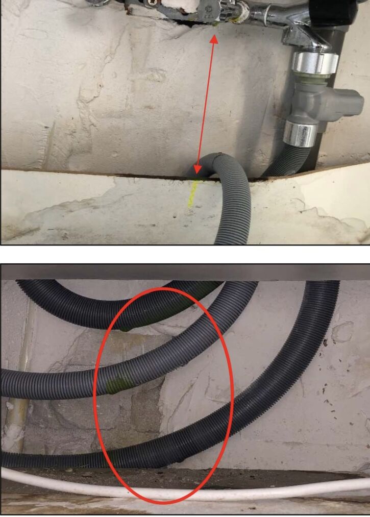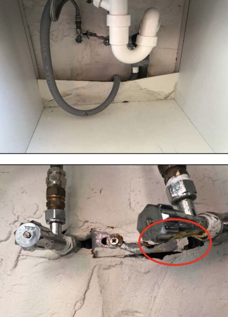 上の写真でわかるように、上階のシンク下部分もかなり水漏れのダメージ。