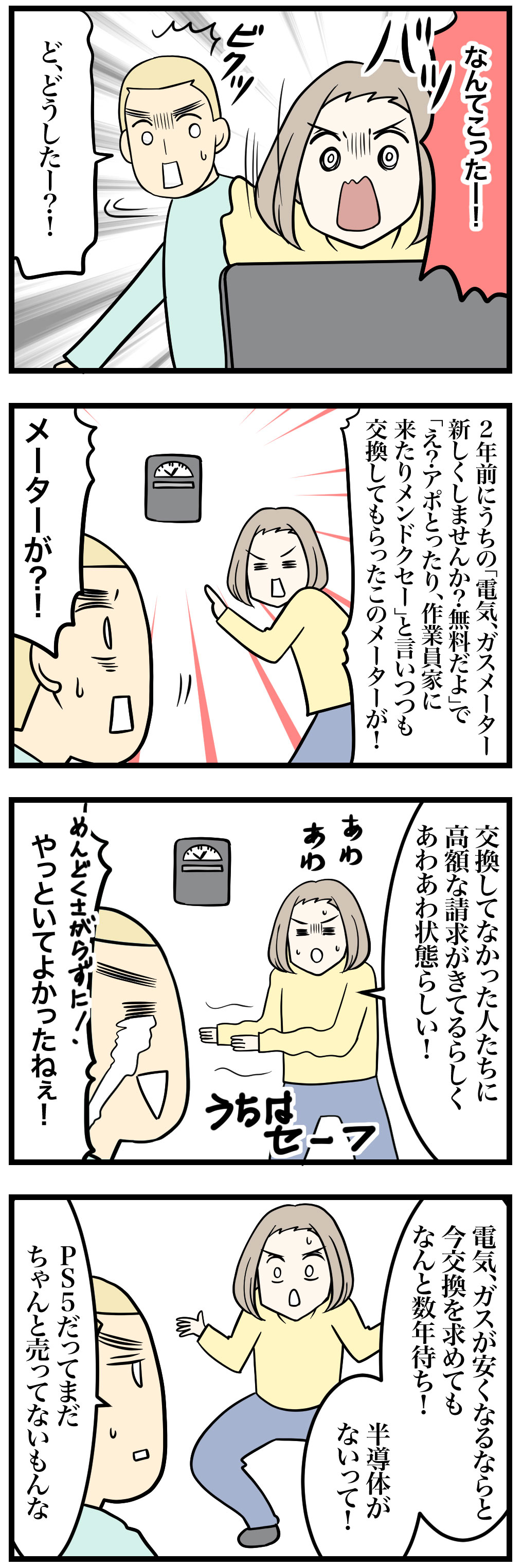 その人たちはアナログメーターなので、実際に使用した量よりも多く支払わされてる問題が起こってるらしく、そのメーターの数値も家人も「うちはいくつだった!」なんて証拠はなく(つど写真でも撮ってれば別。でもそんな人はほぼいない)だから問題になってる。