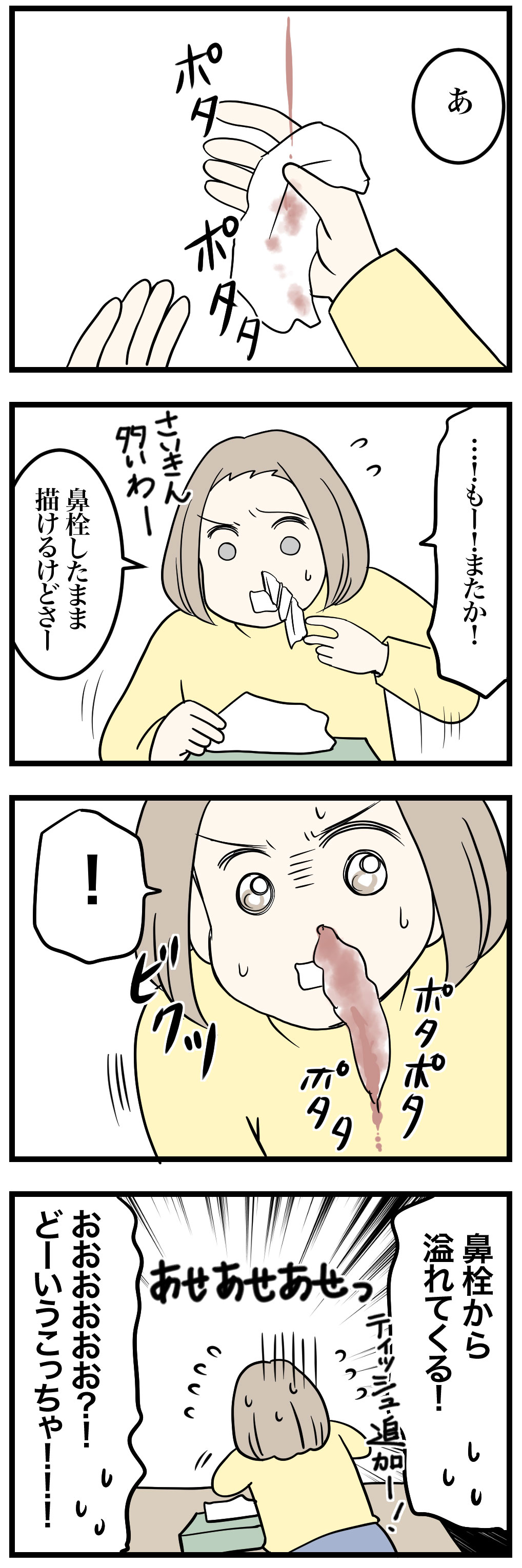 この話は鼻炎で鼻血が珍しくなかったのだけど出血がまったく止まる気配がなくて救急へ行った時の話です。(漫画には出血表現があるので苦手な方はご注意ください)