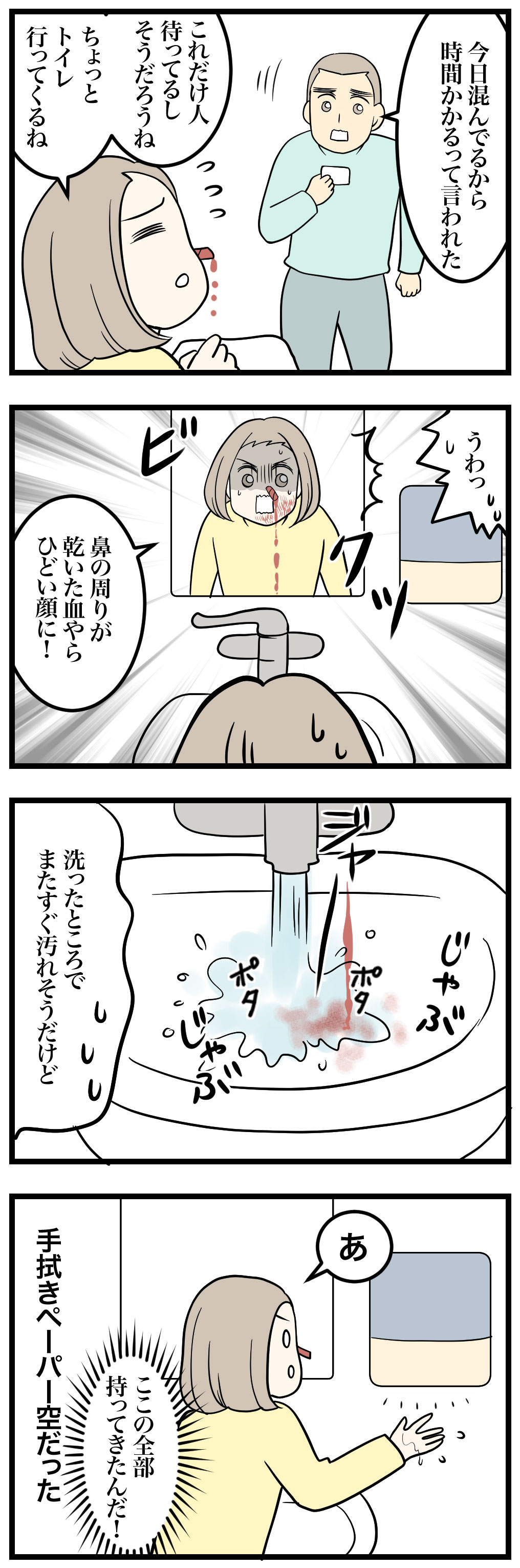 この話は鼻炎で鼻血が珍しくなかったのだけど出血がまったく止まる気配がなくて救急へ行った時の話です。(漫画には出血表現があるので苦手な方はご注意ください)