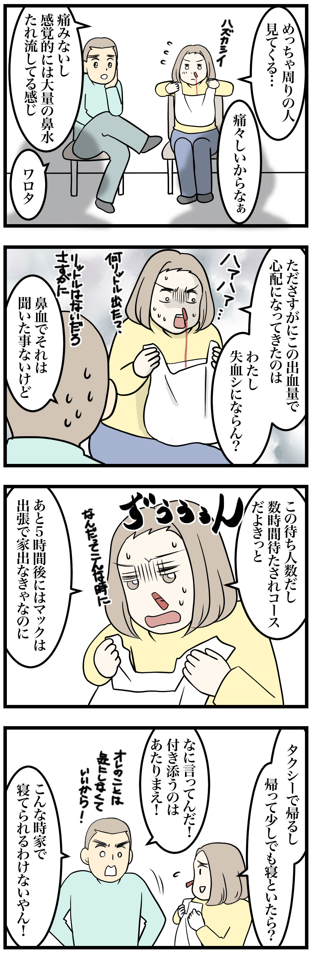 この話は鼻炎で鼻血が珍しくなかったのだけど出血がまったく止まる気配がなくて救急へ行った時の話です。(漫画には出血表現があるので苦手な方はご注意ください)