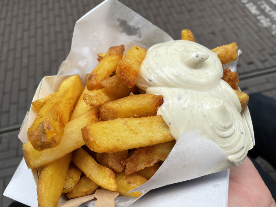 クレープのような紙に、山盛りポテトが積まれてたっぷりのソースぶっかけがオランダ流。