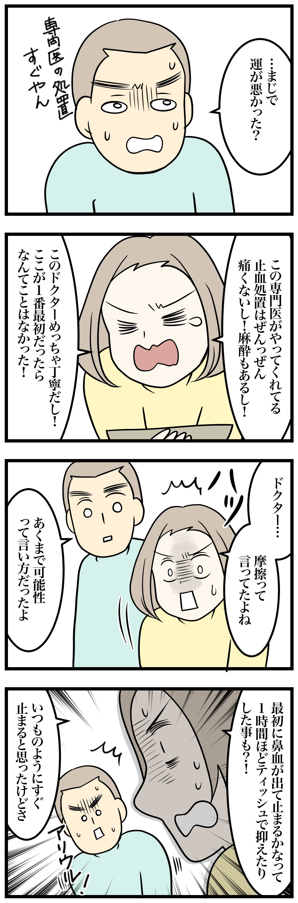 この話は鼻炎で鼻血が珍しくなかったのだけど出血がまったく止まる気配がなくて救急へ行った時の話です。(漫画には出血表現があるので苦手な方はご注意ください)