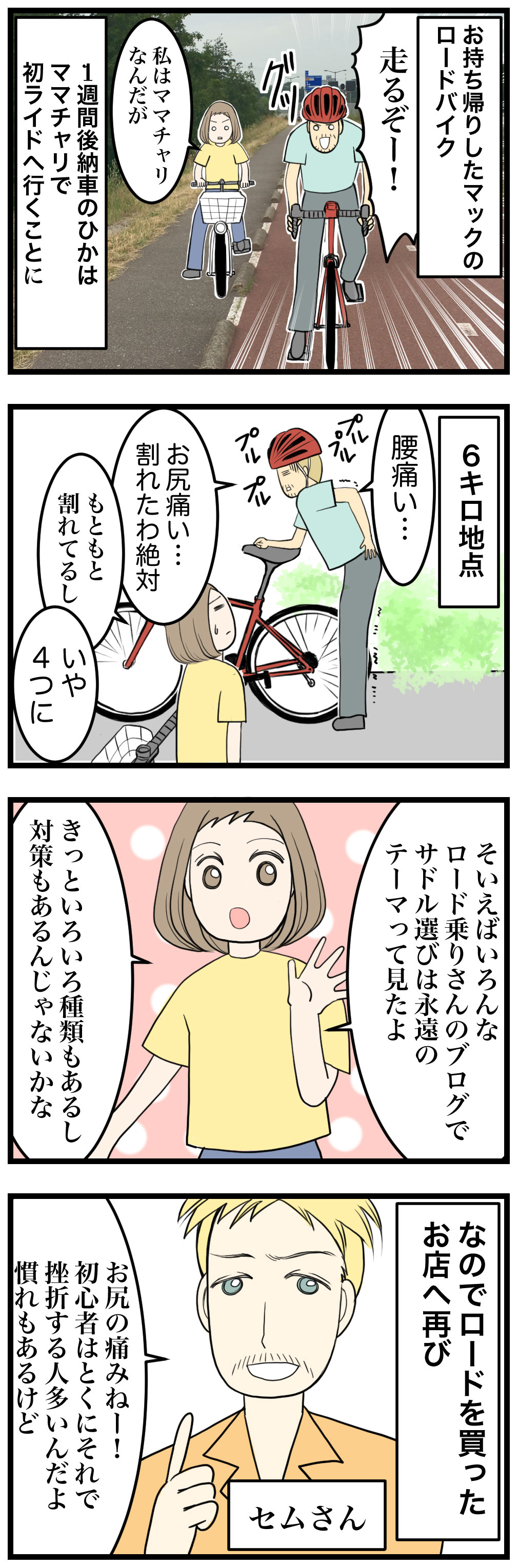 わたしが納車待ちしてるロードバイクは、初心者女性用ってことでサドル(座るところ)はふかふかでした。だけどマックのロードはガチガチにサドルが硬くて、クッションなんてなかった笑