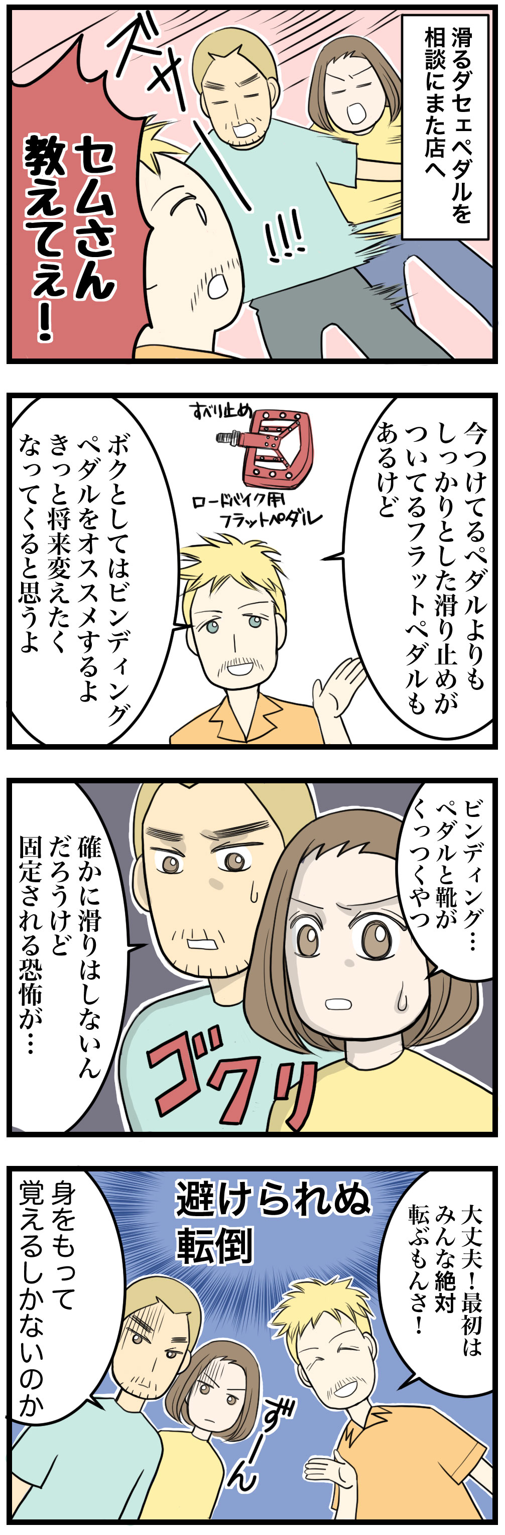 「きっかけ編」で登場した友人の冬ちゃんも、何度か転んだと聞いてたのでビンディングペダルにとって、きっとそれは避けて通れぬ道なんだと思う。