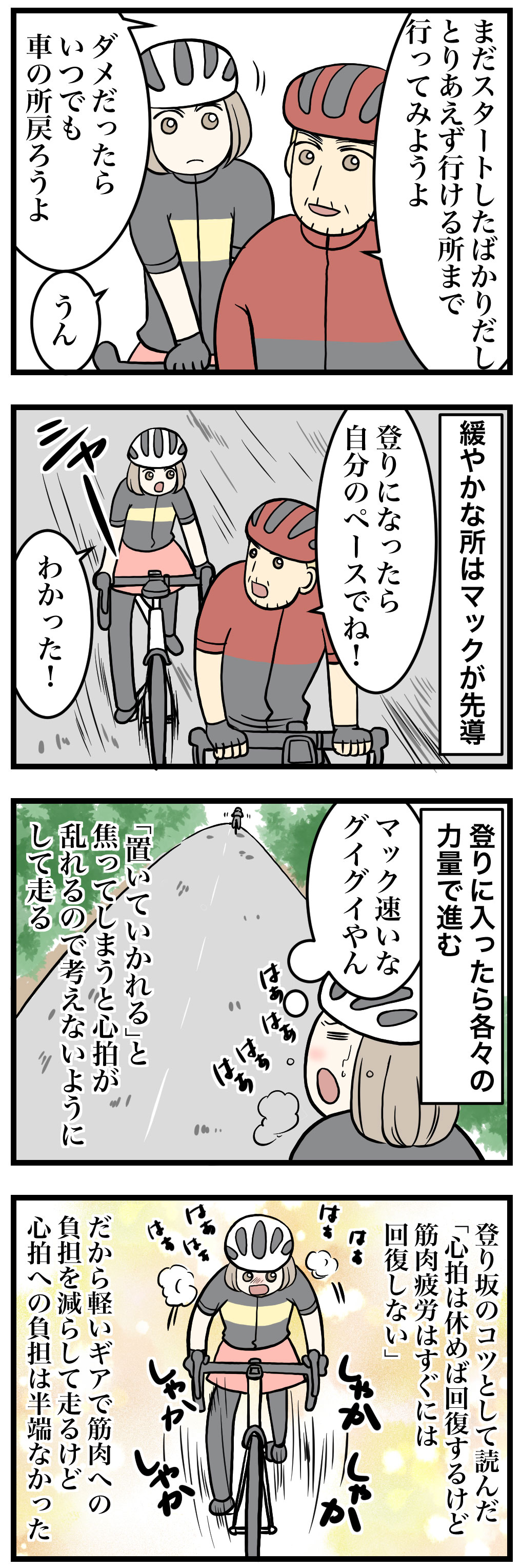 軽いギアで心拍に負担をかけて登るか。