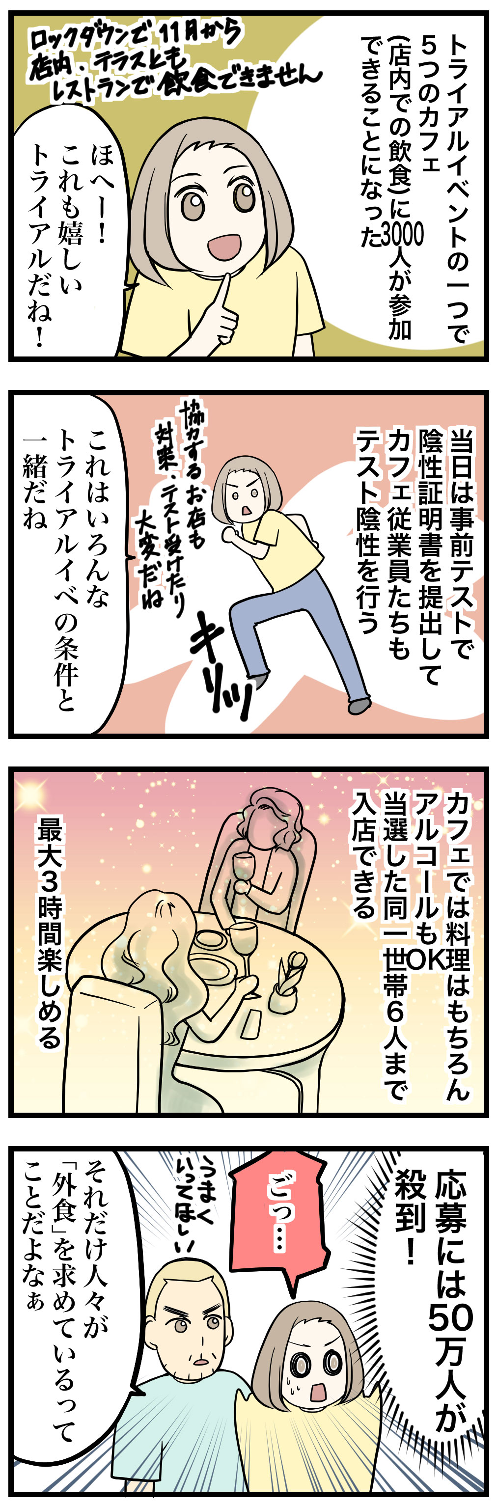 これがうまくいったら、飲食店へ行くたびに、コロナテストを受け陰性証明書が必要になるのかな。